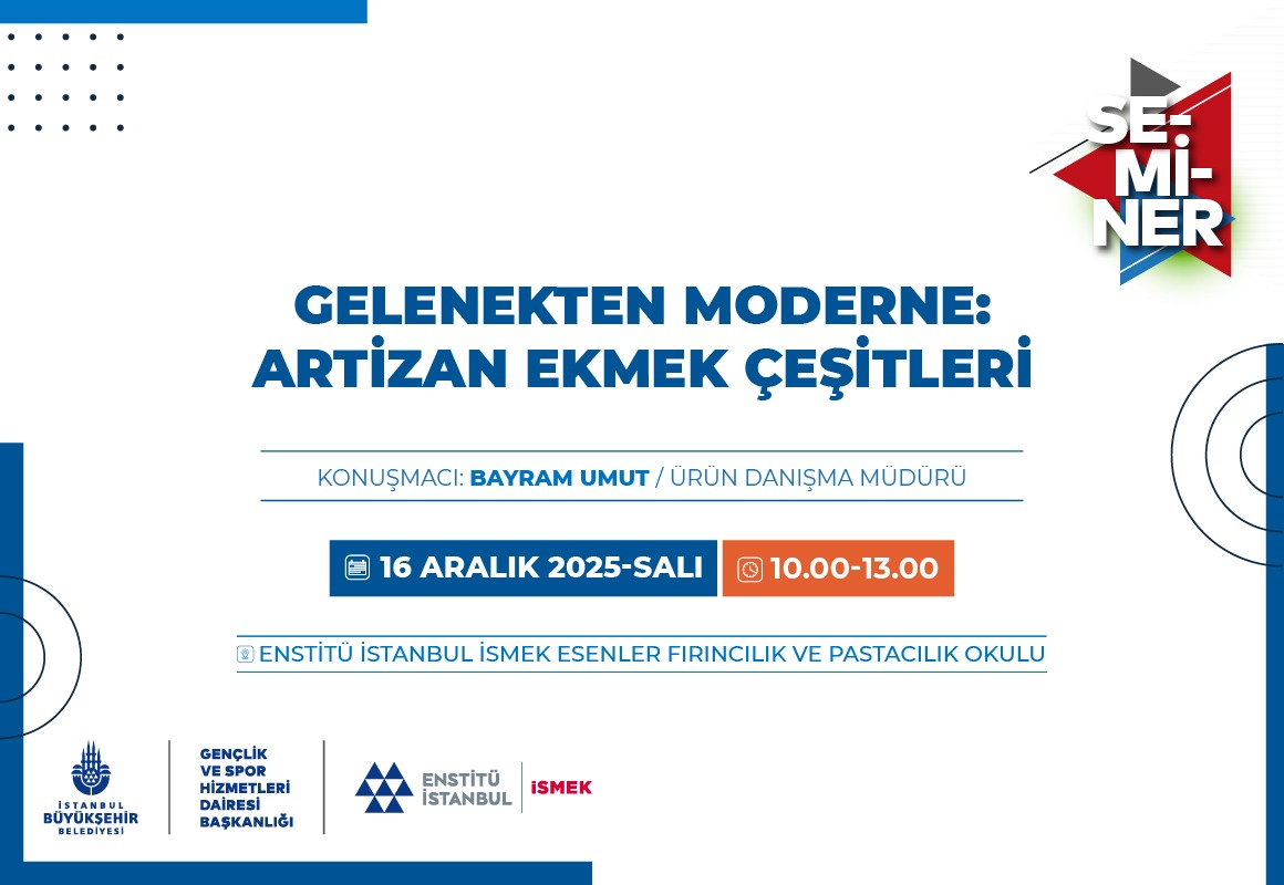 Enstitü İstanbul İSMEK, İstanbullular için Aralık boyunca birbirinden ilgi çekici pek çok konuda seminerler düzenliyor. Bilişim teknolojilerinden gastronomiye, müzikten edebiyata, modadan resim sanatına kadar çok geniş bir yelpazede düzenlenecek seminerlerden ilki, 16 Aralık 2025, Salı günü İstanbullularla buluşacak. “Gelenekten Moderne: Artizan Ekmek Çeşitleri” başlığı altında, Esenler Fırıncılık ve Pastacılık Okulu’nda düzenlenecek seminer, bir un firmasında Ürün Danışma Müdürü olan Bayram Umut’un katılımıyla gerçekleşecek. Geleneksel ekmek üretim tekniklerini, modern artizan yaklaşımlarla birleştirmeye dair yöntemlerin uygulamalı olarak ele alınacağı seminere, tüm İstanbullular davetlidir.