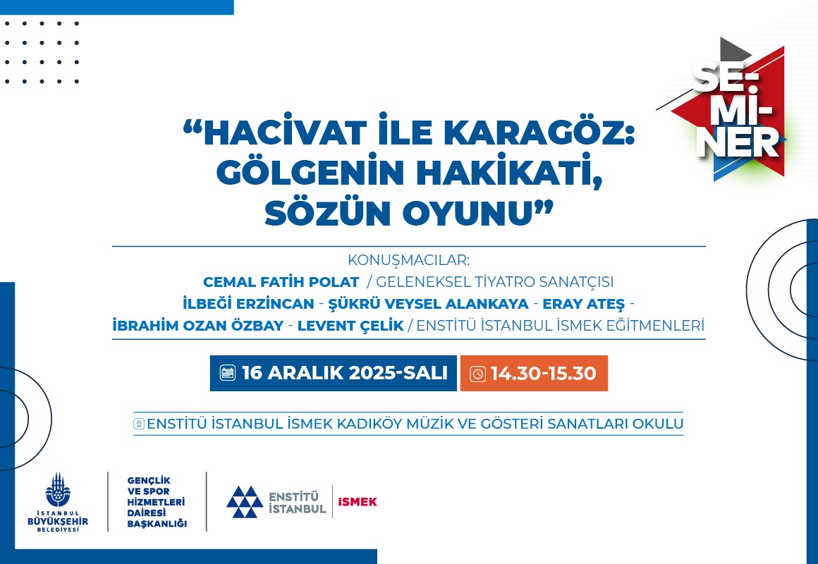 Enstitü İstanbul İSMEK’in Aralık ayı etkinlikleri, gölge oyunu meraklılarını sevindirecek bir seminerle devam ediyor. “Hacivat ile Karagöz: Gölgenin Hakikati, Sözün Oyunu” başlığı altında düzenlenecek seminerde, Karagöz- Hacivat geleneğinin tarihsel kökenleri anlatılarak oyunun, bugünün sahne pratiğine nasıl uyarlanabileceği katılımcılarla paylaşılacak. Karakter tiplerinin ritmi, dili ve mizah anlayışı üzerinden performans tekniklerinin gösterileceği etkinlikte; ses kullanımı, tipler arası ton farkları, doğaçlama prensipleri ve gölge-beden ilişkisi incelenecek. Seminerin son bölümünde ise katılımcılarla kısa ritim-tempo egzersizleri ve basit gölge-perde uygulamaları yapılarak geleneğin hem teorik hem pratik yönü deneyimlenecek. Eğitmenlerimiz İlbeği Erzincan, Şükrü Veysel Alankaya, Eray Ateş, İbrahim Ozan Özbay ve Levent Çelik ile Geleneksel Tiyatro Sanatçısı Cemal Fatih Polat’ın katılımıyla gerçekleşecek etkinliğe tüm İstanbullular davetlidir.