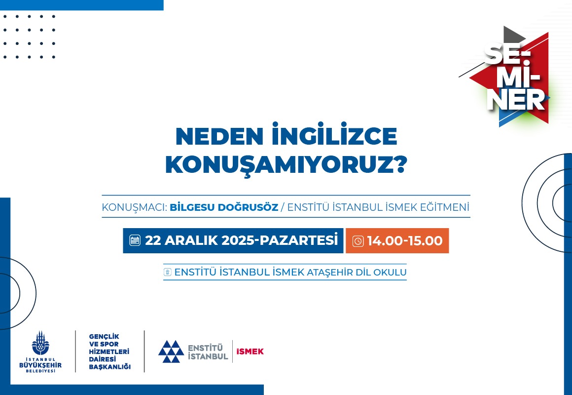 İngilizce öğrenmeye yıllarını veren ama konuşma konusunda güçlük çekenler, Enstitü İstanbul İSMEK’in seminerinde buluşuyor! Eğitmen Bilgesu Doğrusöz’ün rehberliğinde gerçekleşecek “Neden İngilizce Konuşamıyoruz?” semineri, katılımcıların, konuşamamakla ilgili engelleri fark etmelerini ve konuşma becerilerini geliştirecek stratejileri öğrenmesini amaçlıyor. Konuşma sırasında yaşanan tereddüt ve çekingenliği azaltmaya yönelik pratik çözümler, konuşmayı geliştirmek için uygulanabilir teknikler, stratejiler ve günlük rutinlerin paylaşılacağı seminere tüm İstanbullular davetlidir.