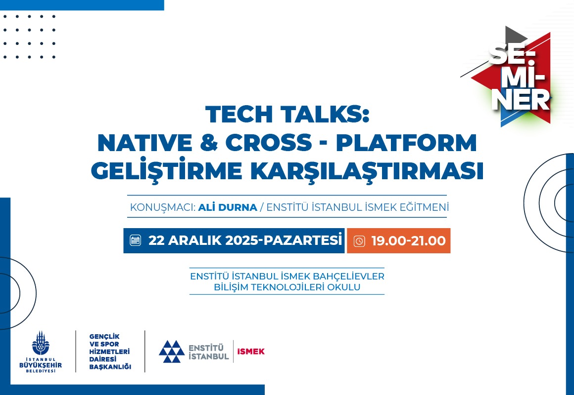 Enstitü İstanbul İSMEK, Aralık ayı etkinliklerine, teknoloji profesyonellerini ilgilendiren bir seminerle devam ediyor. Eğitmen Ali Durna’nın katılacağı seminer, “Tech Talks: Native & Cross - Platform Geliştirme Karşılaştırması” başlığını taşıyor. Katılımcılara, mobil geliştirme alanında sektör standardı İngilizce kelime ve kavramları kazandırmayı amaçlayan seminer, teknoloji profesyonellerinin, teknik İngilizce becerilerini yazılım mimarisi kavramlarıyla birleştirerek geliştirmelerine yardımcı olmayı amaçlıyor. “Hız ve Görünüm Arasındaki Denge”, “Native ve Cross - Platform Yaklaşımlarının Basit Benzetmelerle Karşılaştırılması”, “Gerçek Hayat Senaryolarının Analizi: Düşük Bütçeli Girişimler, Yüksek Performanslı Oyunlar” ve “Grup Tartışması: Verimlilik mi Mükemmellik mi?”, seminerin temel başlıklarını oluşturuyor. Seminere tüm İstanbullular davetlidir.