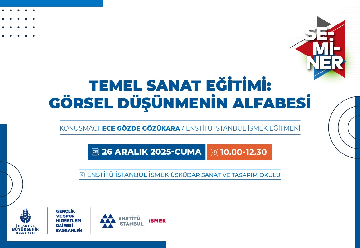 Enstitü İstanbul İSMEK, Aralık ayı okul seminerleri kapsamında “Temel Sanat Eğitimi: Görsel Düşünmenin Alfabesi” başlıklı bir seminer düzenliyor. Görsel düşünmenin temel öğe ve ilkeleri ile yaratıcı ifade biçimlerinin ele alınacağı seminer, Ece Gözde Gözükara’nın anlatımıyla Üsküdar Sanat ve Tasarım Okulu’nda gerçekleşecek. Temel Sanat Öğe ve İlkeleri, Biçim ve İçerik İlişkisi, Algı ve Görsel Okuma gibi konuların ele alınacağı seminer ile katılımcılara, görsel iletişim araçlarını etkili ve bilinçli kullanabilme becerisi kazandırılması hedefleniyor. Seminere tüm İstanbullular davetlidir.