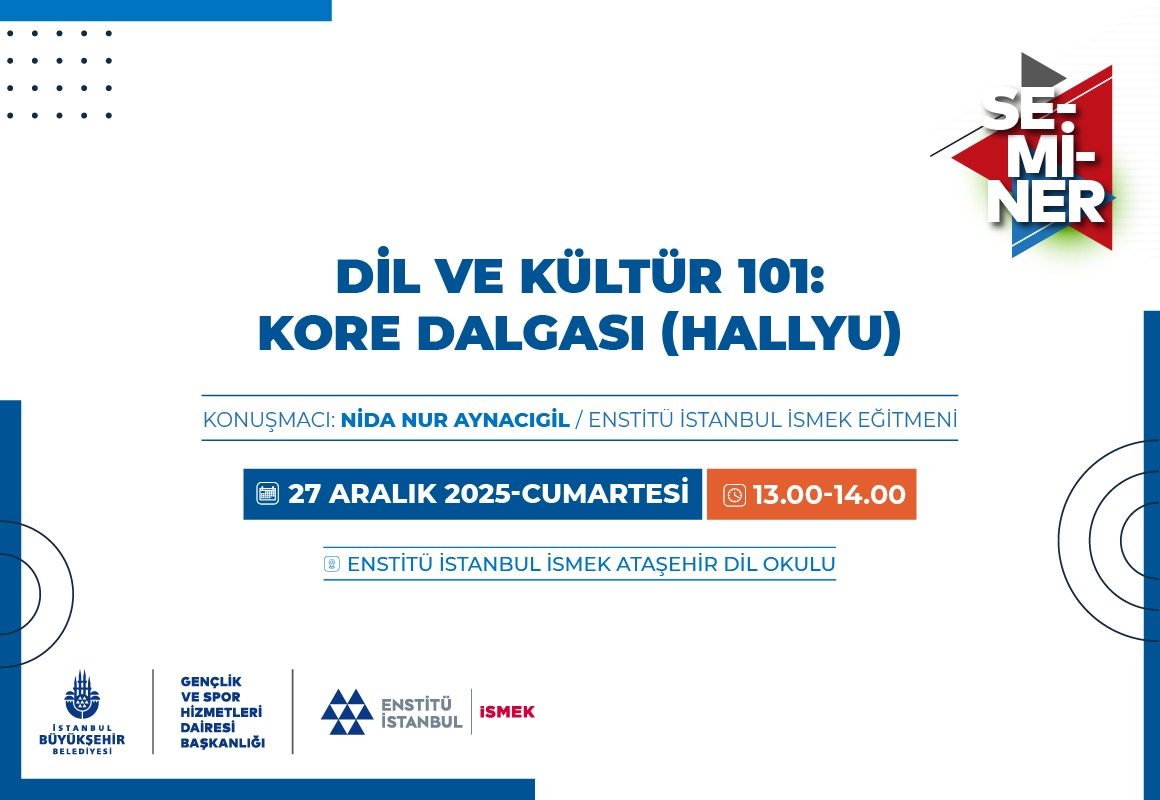 Enstitü İstanbul İSMEK, popüler Kore kültürünün dünya geneline yayılmasını ifade eden Kore Dalgası’nın ele alınacağı “Dil ve Kültür 101: Kore Dalgası (Hallyu)” başlıklı bir seminere ev sahipliği yapıyor. Korece Eğitmeni Nida Nur Aynacıgil’in katılımıyla gerçekleşecek seminerde, Kore Dalgası’nın kültürel içeriklerinin Korece öğrenme sürecini nasıl etkilediği anlatılacak, kültür ile dil arasındaki ilişki, güncel örneklerle değerlendirilecek. Seminere tüm İstanbullular davetlidir.