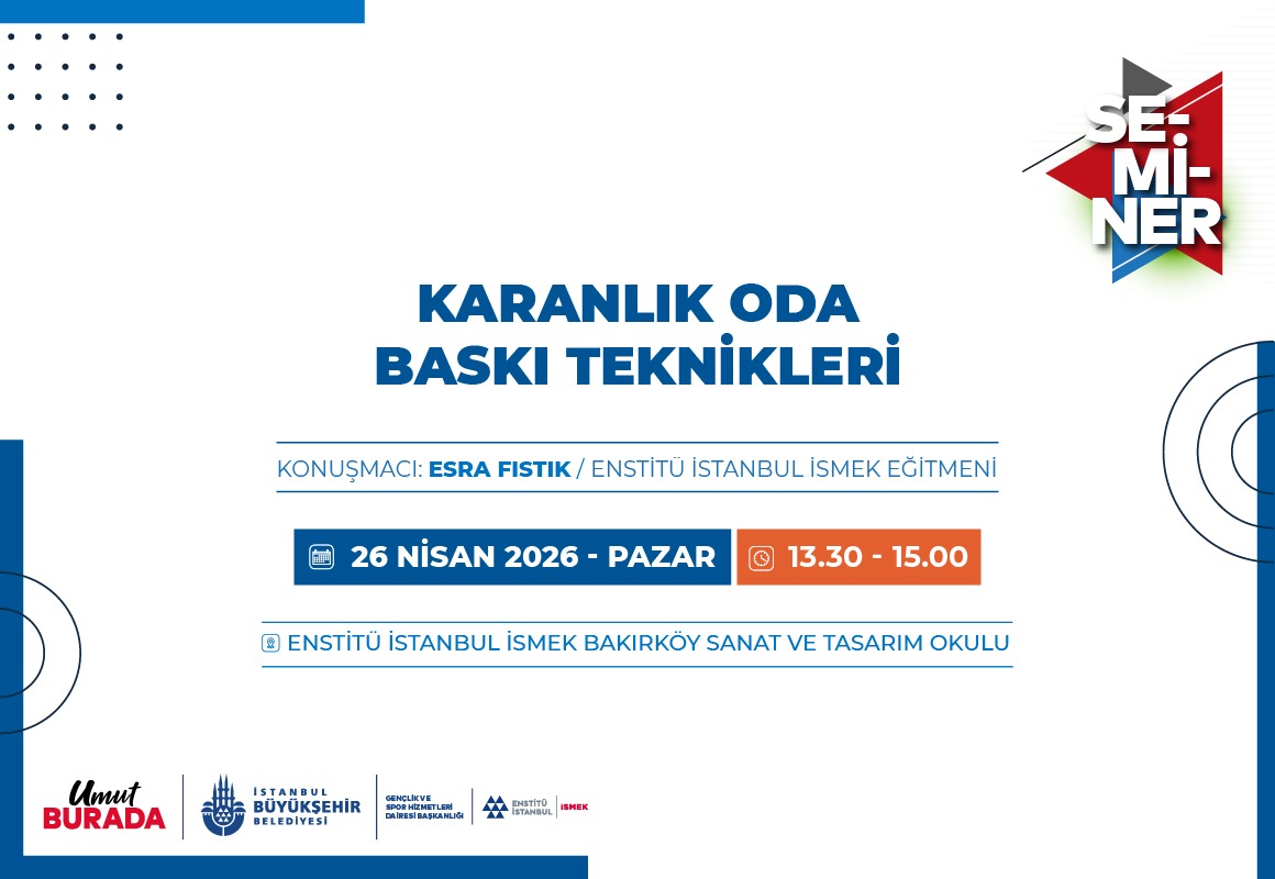Enstitü İstanbul İSMEK, Nisan ayı etkinlikleri kapsamında “Karanlık Oda Baskı Teknikleri” başlıklı bir seminer düzenliyor. Eğitmen Esra Fıstık’ın rehberliğinde, Bakırköy Sanat ve Tasarım Okulu’nda gerçekleşecek seminerde, analog fotoğrafa ilgi duyan katılımcılara, karanlık odada gerçekleştirilecek fotoğraf baskı teknikleri ve yöntemleri anlatılacak. Analog Fotoğrafın Değerlendirilmesi, Farklı Baskı Yöntemlerinin Anlatılması, Farklı Kimyasalları Tanıtılması, seminerin konu başlıklarını oluşturuyor.