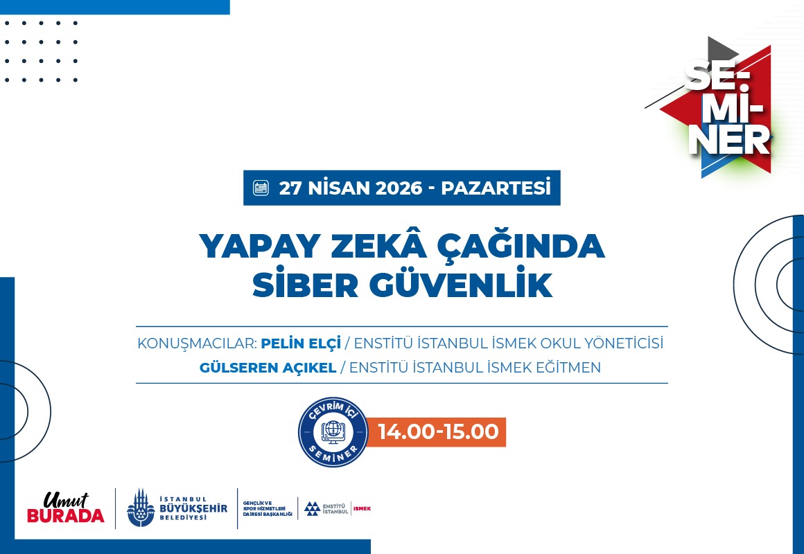 Enstitü İstanbul İSMEK, Nisan ayı etkinlikleri kapsamında düzenlediği seminerler dizisinde, çok ilgi çekici bir konuyu ele alıyor. “Yapay Zekâ Çağında Siber Güvenlik ve Network: Fırsatlar ve Dönüşümler” başlığı altında verilecek seminer, Enstitü İstanbul İSMEK eğitmenleri Pelin Elçi ve Gülseren Açıkel’in katılımıyla gerçekleşecek. Yapay zekâ çağında network ve siber güvenlik alanlarının nasıl şekillendiği konusunun, katılımcılara kısa ve anlaşılır şekilde anlatılacağı seminerle, bu alanlara girmek isteyenler için net bir kariyer yol haritası sunulması amaçlanıyor. Seminere tüm İstanbullular davetlidir.