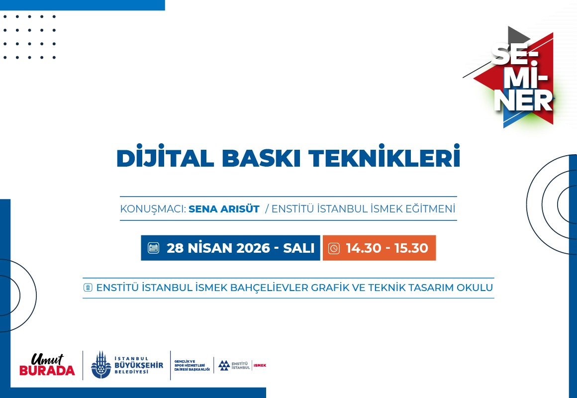 Enstitü İstanbul İSMEK, Nisan ayı etkinliklerinden biri de “Dijital Baskı Teknikleri” başlığı altında düzenlenecek okul semineri. Eğitmen Sena Arısüt’ün anlatımıyla Bahçelievler Muhasebe ve Finans Okulu’nda gerçekleşecek seminerde, katılımcılara, dijital baskı teknikleri, baskı türleri ve dijital çalışmaların baskıya hazırlanma sürecinde dikkat edilmesi gereken hususlar hakkında genel bilgiler verilecek.