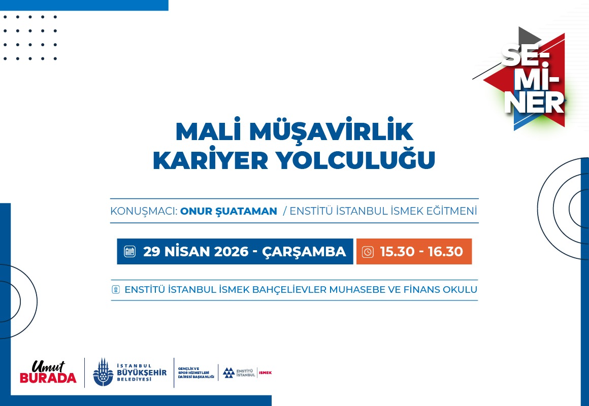 Enstitü İstanbul İSMEK’in, “Mali Müşavirlik Kariyer Yolculuğu” başlığı altında düzenlediği seminer, Bahçelievler Muhasebe ve Finans Okulu’nda, eğitmen Onur Şuataman’ın rehberliğinde gerçekleşecek. Katılımcılara, mali müşavirlik mesleğine yönelik süreçler hakkında bilgi verilecek seminerle, ara eleman olarak çalışanlara SMMM süreçlerini tanıtma ve kariyer planlamalarına yönelik rehberlik edilmesi de hedefleniyor.